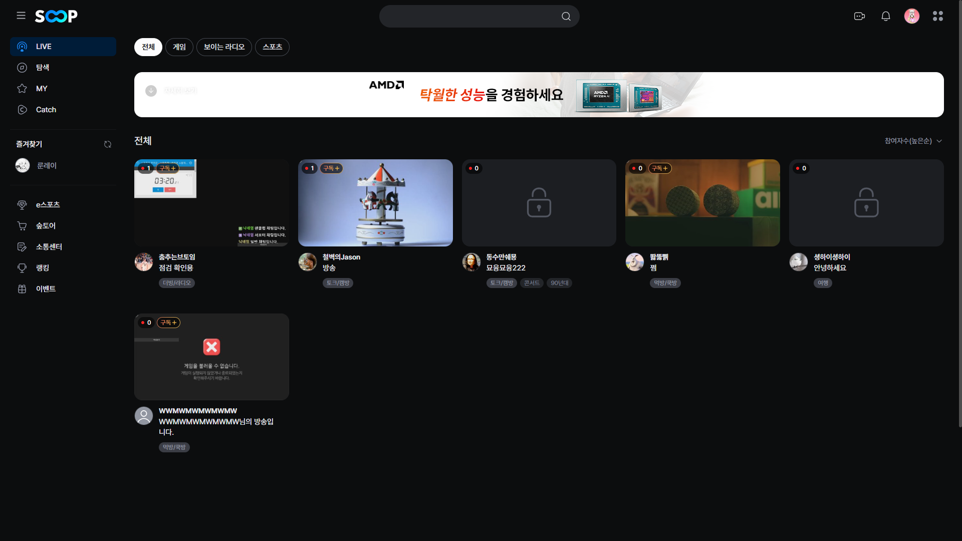 새로고침을 해봤을때 몇몇 방송들이 켜진 상황
